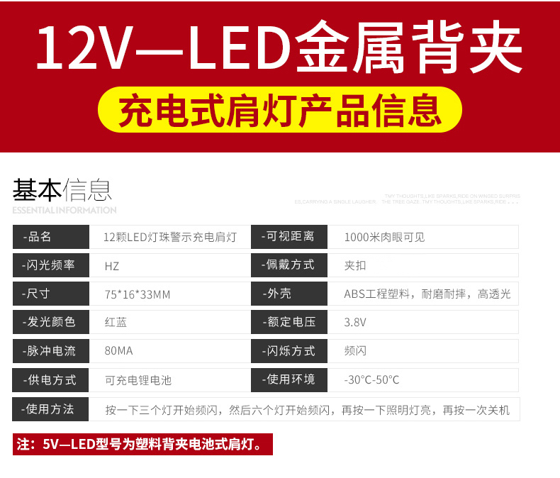 執勤肩燈主要用于公路交通工作人員,道路環衛工人以及行人夜間道路安全警示,通過多模式,高警示,自主LED發光提醒過往司機亮燈處有人員存在,小心駕駛,從而達到保護佩戴者的功能。曾經有新聞報道,小小的肩燈給一個在火災中的生命帶來生存的希望,如果沒有這個肩燈,那消防救助員就不容易發現他。相信小小的肩燈會實現越來越多,越來越大的功能,可以說肩燈在某些環境是保命的法寶。公司所生產的充電肩燈和電池肩燈都是通過LED自主多模式發光,實現爆閃,流水閃,頻閃等高警示閃光,起到非常好的警示效果。