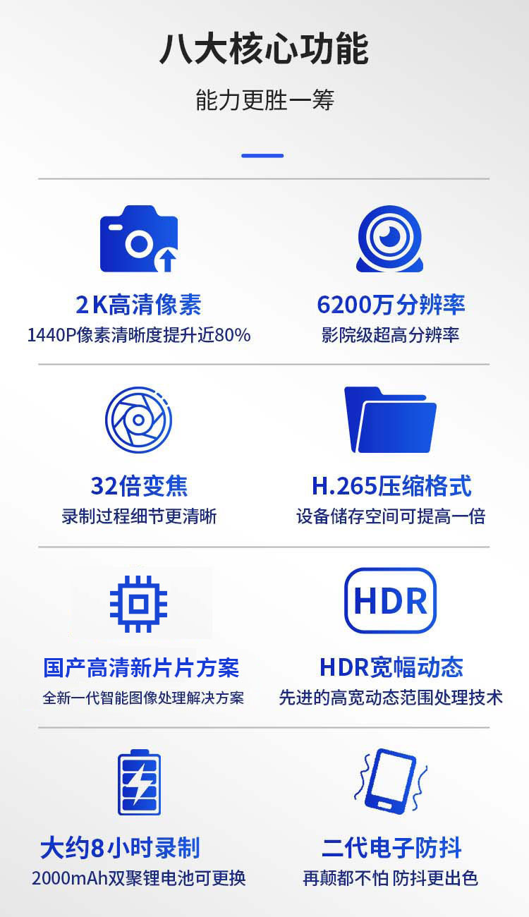 本機采用的可拆卸鋰電池2000毫安,更換一次電池1080P分辨率下可連續工作時間14小時以上。隨時隨地進行執法記錄。標配2塊電池,另可根據需要配備外接電池盒,實現超長續航時間。