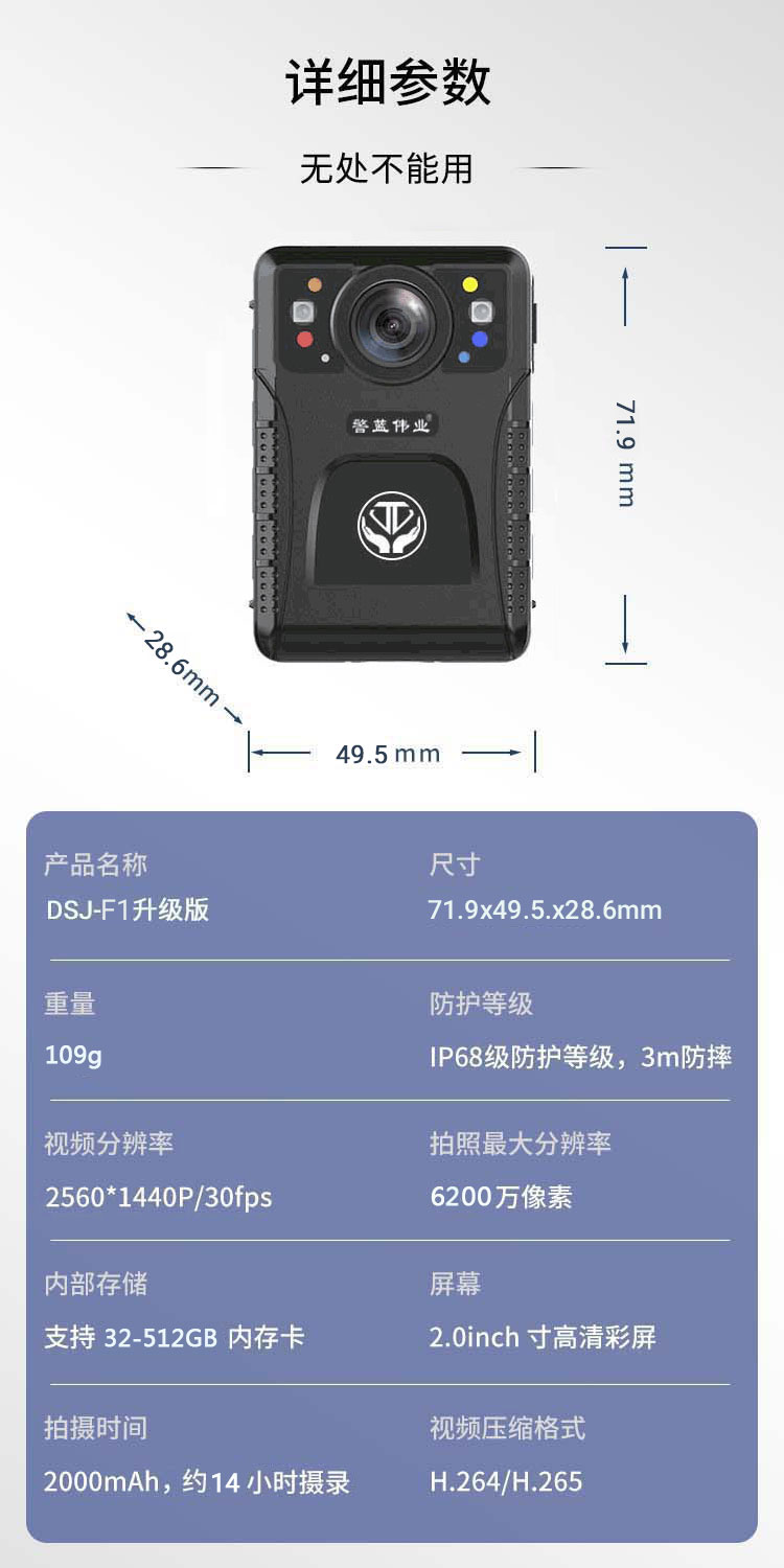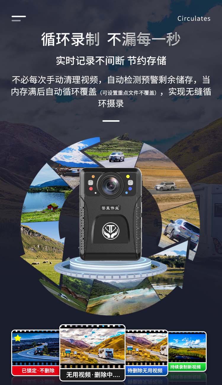 本產品是主要針對執法部門的特殊使用需求,研發生產的新一代最小最輕便全天候執法記錄設備,本產品能夠對執法現場進行動態、靜態的音視頻記錄。特有的紅藍警示燈、遠距離紅外光源和白光燈設計,保證了在夜間全黑環境下的執法記錄效果。是執法部門實現信息化、規范化的有力工具。
