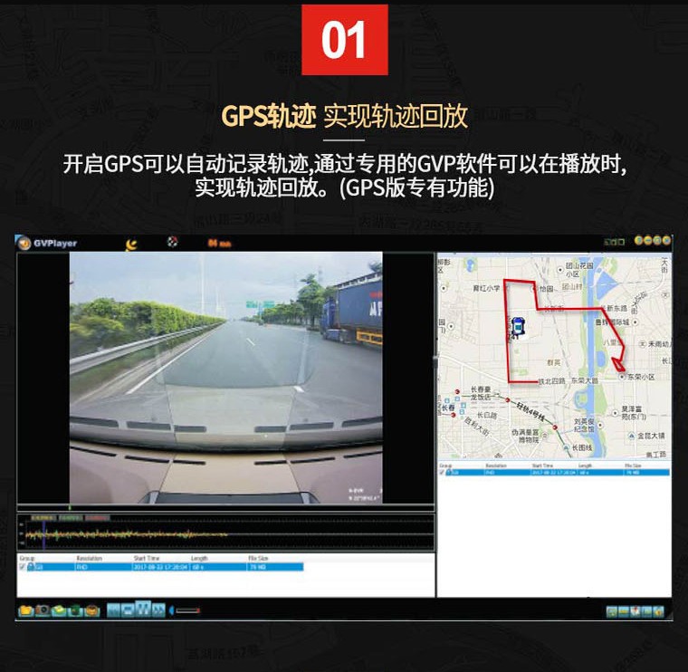v GPS軌跡,開啟GPS可以自動記錄軌跡,通過專用的GVP軟件可以在播放時,實現軌跡回放。(GPS版專有功能);