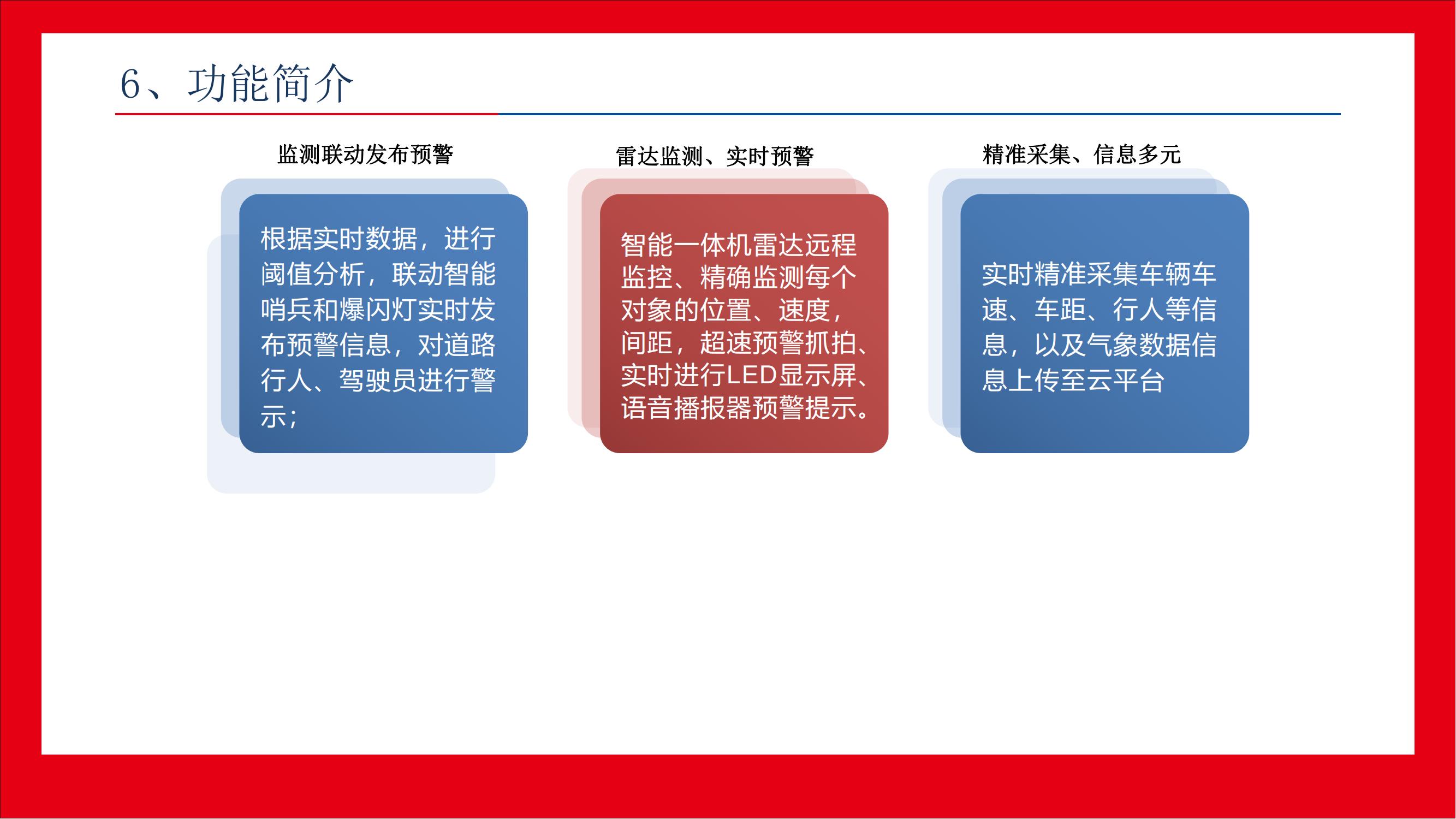 l 一體化設備:集雷達監測、聲音預警(號角喇叭)、燈光預警(紅藍爆閃燈、速度顯示、文字顯示)、視頻取證等功能,對行車安全起到預警作用。